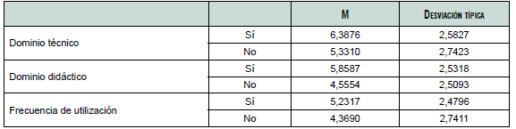 Con base en este dato, indagamos si el haber utilizado la plataforma, o no, y sus diferentes herramientas se podía relacionar con el dominio técnico y didáctico que el profesorado informaba poseer de ella, como autopercepción de habilidad. Al mismo tiempo, si la frecuencia de utilización por parte del profesorado estaba marcada por los dominios técnicos y didácticos expresados.