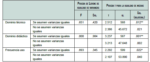 A fin de analizar si se habían establecido diferencias significativas, desde un punto de vista estadístico, entre la utilización de las diferentes herramientas y el dominio técnico, didáctico y frecuencia de utilización del AVA, aplicamos de nuevo la t de Student para muestras independientes. La hipótesis formulada se orientó a la misma dirección de la presentada antes.