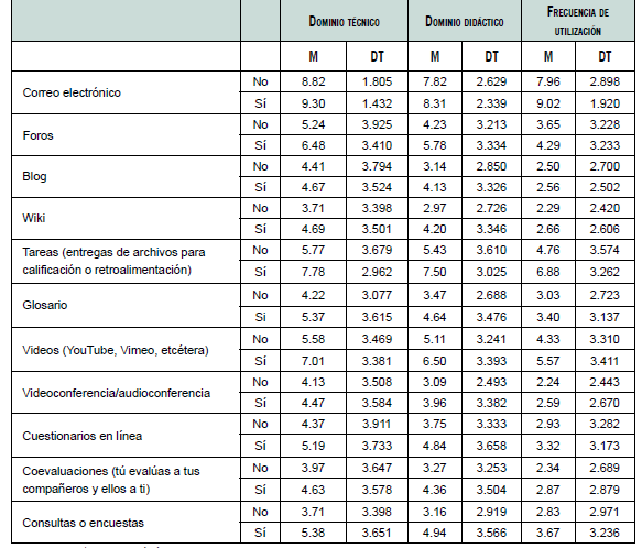 Diferentes aspectos pueden destacarse de la tabla anterior, por ejemplo, las puntuaciones medianas de las medias del profesorado que indicó que sí había utilizado el AVA en el año en ejercicio son más elevadas en el dominio técnico que en el didáctico, en la totalidad de las herramientas. Los datos muestran que las medias del profesorado que ha recurrido al AVA en el último año son superiores a las medias del profesorado que dijo que no.