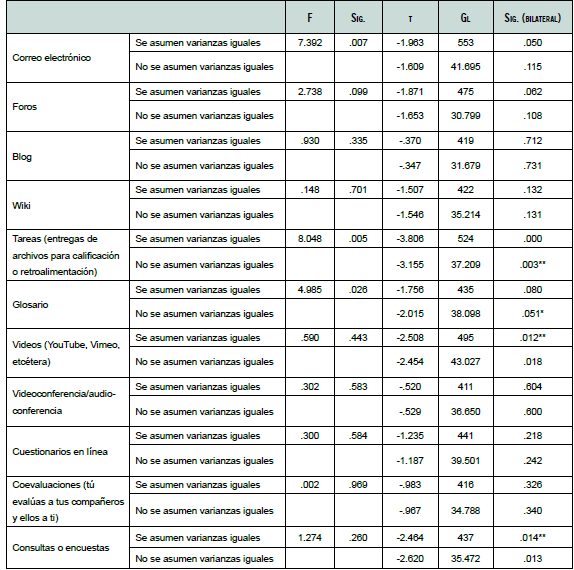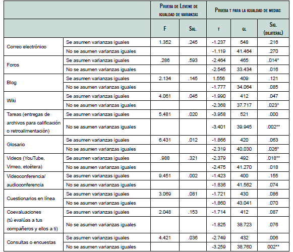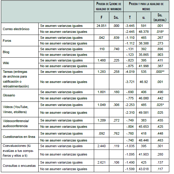 En este caso solo se rechaza la H0 en el correo electrónico, videos (YouTube, Vimeo, etcétera) y en las tareas (entregas de archivos para calificación o retroalimentación) con un riesgo alfa de equivocarnos del 0.05 en el primero y en el tercero de los casos, así como al 0.01 en el segundo. Los motivos de la mayor frecuencia de utilización en el caso del correo electrónico y en las tareas es que son actividades fuertemente asociadas al uso de una plataforma.