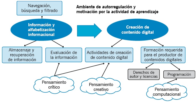 En resumen, el análisis del binomio gestión de la información/creación de contenidos en línea conlleva considerar dos áreas de las competencias digitales: la información y alfabetización informacional, y la creación de contenido digital. La primera involucra el desarrollo del pensamiento crítico para la selección de información de calidad; mientras que la segunda requiere conocimientos y habilidades en derechos de autor y licencias, así como en programación. Esta última dimensión implica procesos del pensamiento computacional. Para el desarrollo de un producto será primordial considerar el nivel de autorregulación y motivación del aprendiz para ejecutar la actividad encomendada (ver figura).