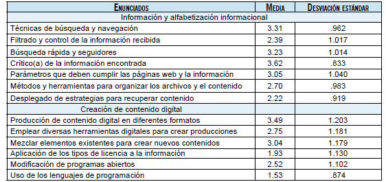 En el análisis de la confiabilidad de la escala de trece ítems se reportó un alfa de Cronbach de .822, lo que representó un índice satisfactorio de fiabilidad (por arriba del mínimo establecido, 70) (Malhotra, 2008). Respecto a la información y alfabetización informacional, observamos que los ítems con los valores más altos fueron: crítico(a) de la información encontrada (3.62) y las técnicas de búsqueda y navegación (3.31). En contraparte, los valores mínimos los obtuvieron: desplegado de estrategias para recuperar contenido (2.22), así como filtrado y control de la información recibida (2.39). De los valores de la creación de contenido digital, encontramos que la producción de contenido digital en diferentes formatos (3.49) y el acto de mezclar elementos existentes para crear nuevos contenidos obtuvieron los valores más altos (3.04). El uso de los lenguajes de programación (1.53) y la aplicación de los tipos de licencia a la información (1.93) reflejaron una menor puntuación (ver tabla 1).