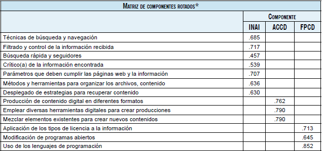 Referente a los temas de validez del instrumento, la validez de contenido se justificó con la revisión de literatura sobre competencia digital y la construcción del estado del arte (Instituto Vasco de Cualificaciones y Formación Profesional, 2014; INTEF, 2017). En cuanto a la validez de constructo, desarrollamos el análisis factorial exploratorio de componentes principales con rotación varimax, a partir del criterio de Kaiser para cada constructo (Henry Pedroza, 2007). Como resultado, obtuvimos que la escala mostró un nivel superior (0.80) que cumple con los criterios de la prueba de Kaiser-Meyer-Olkin (valor superior a 0.05). De igual forma, la prueba de esfericidad (un valor menor de 0.05) y los porcentajes de varianza explicada se ubicaron por arriba del 50% (55.33%). Estos resultados permitieron proceder al ejercicio de factorización.
