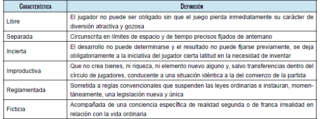 Caillois (1991) describe la palabra juego como “una actividad que es esencialmente libre/voluntaria, separada en el tiempo y el espacio, incierta e improductiva que se rige por las reglas de la fantasía”. Este autor precisa las características que distinguen el juego de las otras prácticas humanas (ver tabla 1).
