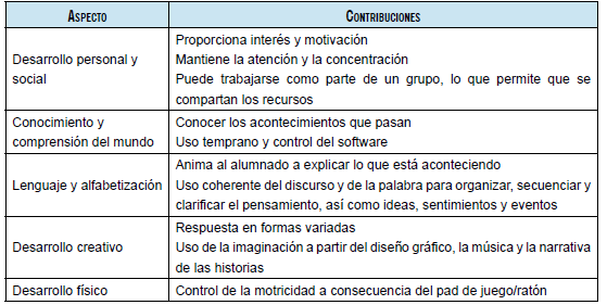 El uso de videojuegos en las aulas es coherente con las teorías de la educación basada en competencias que destacan el desarrollo constructivo de habilidades, conocimientos y actitudes (Gómez, Espinosa y Albajes, 2013). Para ello, debe considerarse al juego como un producto y un material docente en el aula. Podemos afirmar que los videojuegos permiten aumentar el rendimiento escolar y fomentar habilidades cognitivas, lo que, en general, motiva el aprendizaje y mejora el proceso de enseñanza-aprendizaje pautado en el aula (Rosas et al., 2003). En la tabla 2 resumimos algunas de las tareas de aprendizaje en las que los videojuegos pueden contribuir a su desarrollo.