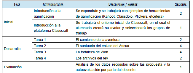 Es necesario aclarar que las tareas que aparecen a continuación no sustituyen a la planificación y el planteamiento tradicional de la asignatura, sino que, a partir de estas y de los conocimientos adquiridos, se dedica una sesión semanal a la realización de las actividades gamificadas, con el objetivo de motivar al alumnado a poner en práctica los conocimientos impartidos. En este sentido, hemos estimado que la planificación tendrá una duración aproximada de un trimestre (el inicial), con la posibilidad de extenderlo si los resultados responden a los objetivos planteados. Para ello, contamos con tres sesiones semanales (lunes, jueves y viernes) de 45 minutos cada una. En la tabla 3 se muestran las fases en las que se divide la propuesta.