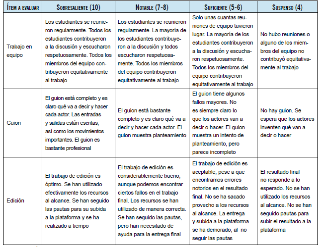Esta propuesta didáctica se desarrolla a través de cuatro tareas centrales basadas en Classcraft. La primera se considera como una introducción detallada al universo que acompañará al alumnado durante un trimestre y, por lo tanto, no evaluable, las tres tareas restantes presentan criterios distintos de evaluación. De esta forma, la evaluación de la tarea 2 se realizará mediante la rúbrica de la tabla 4.