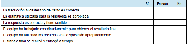 La cuarta y última tarea se basa en la traducción, interpretación y respuesta al texto original, usa una lista de control (ver tabla 5) para su evaluación.