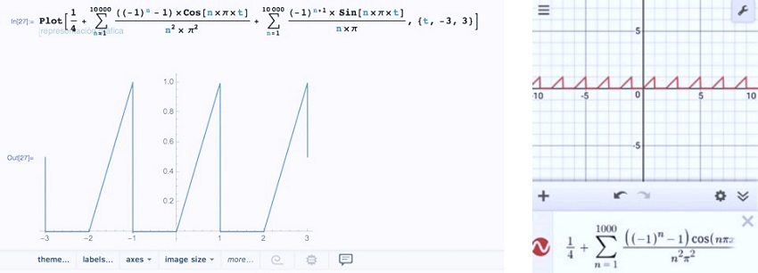 Al llegar a la etapa de los temas de transformada de Laplace (tercero y cuarto del curso), notamos que no existen app.m evolucionadas para resolver EDO que les involucren, y se cuenta solo con software de escritorio. Ante esto, el curso siguió en el orden tradicional, es decir, resolución de EDO de condiciones iniciales utilizando transformada de Laplace, cuya solución fue interpretada en algún graficador app.m. Para el quinto tema del curso, series de Fourier, nos interesamos por las graficadores que devolvieran la gráfica solución de ecuaciones diferenciales, que representan los sistemas físicos masa-resorte, cuya función ordenadora fuera periódica en un intervalo dado. En este caso, y por las condiciones impuestas, solo Desmos devolvió gráficas en el orden requerido.