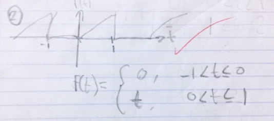Otro de los estudiantes usó el mismo criterio y concluyó que la función esperada era una recta, aquella que se encuentra entre 0 < t < 1, y una parábola invertida trasladada sobre el eje x, la ubicada en el intervalo 1 < t < 2. Escribió la función en la forma: