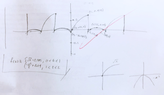 En ese escenario, el alumno amplificó la imagen resultante en la interfaz de la app.m y observó que la curva que se acomoda al eje x corta en dos puntos cuyas coordenadas se obtuvieron con el software; estimó también aquellas en las que se encuentran los pliegues de ambas, así como las que corresponden al valor máximo de la primera. En ese momento, el interés del alumno era determinar las expresiones analíticas de cada curva y utilizó para esto las coordenadas rectangulares descritas, así como la visión que tenía del comportamiento tendencial de cada una. Supuso la primera, que se encuentra entre 1 < t < 2, como una parábola invertida y la otra, ubicada entre 0 < t < 1, como una función radical trasladada sobre el eje y. Ante esto, expresó la función esperada, como: