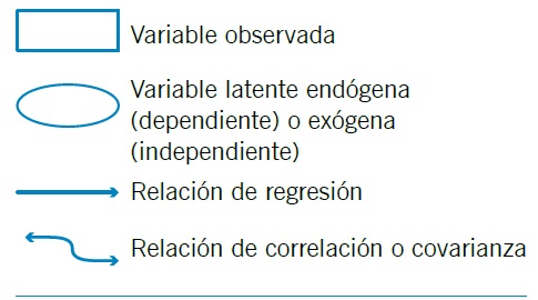 Otro aspecto importante de este análisis es que nos permite establecer la equivalencia de los parámetros. Este análisis se representa a través de diagramas de senderos (path diagram). Los rectángulos representan las variables observadas, en general, los ítems; las variables latentes, tanto endógenas como exógenas, se representan por elipses. La relación que se presenta entre una variable observada y una variable latente es unidireccional y se representa con una flecha. Las relaciones entre las variables latentes pueden ser bidireccionales y se configuran por líneas curvas con una flecha en cada extremo. Los errores asociados a la variable endógena se representan sin círculos ni óvalos. Al ser una variable no observada, muchos programas computacionales sí lo hacen, aunque con un tamaño mucho menor que las variables latentes (ver figura 1).