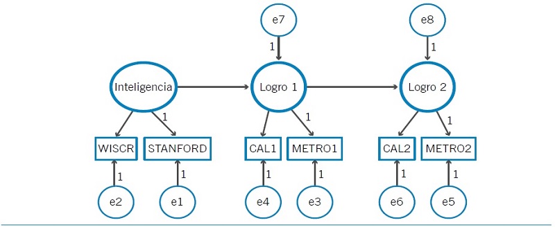 En la figura 2 (página siguiente) se muestra el diagrama de senderos del ejemplo anterior, en el que wiscr, stanford, cal 1, metro 1, cal 2 y metro 2 son las escalas de medición para cada una de las variables latentes independientes y dependientes, mediante las variables observadas independientes y dependientes, respectivamente. Los e1-e6 denotan los errores para cada una de las variables observadas, e7 y e8 son los errores asociados a las variables latentes logro 1 y logro 2, en ese orden. La variable inteligencia no tiene asociado error por ser nuestra variable independiente o exógena.