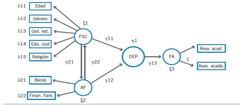A continuación, presentamos varios modelos propuestos, los cuales indican los tipos de variables que intervienen y las relaciones entre constructos. En la figura 3 damos a conocer el modelo causal propuesto en el que se observan los factores socioculturales (FSC), factores financieros (AF) y factores académicos (FA) que influyen en la deserción escolar en el nivel posgrado (DEP). Las variables exógenas son los FSC (ξ1), AF (ξ2) y FA (ξ3); las endógenas, la DEP (η1). La edad (λ11), género (λ12), último grado de estudios (λ13) y estado civil (λ14) …………. λ32 son las variables observadas endógenas. Las relaciones que existen entre los constructos están determinadas por γ11 (FSC-DEP), γ12 (AF-DEP), γ13 (FA-DEP), γ21 (FSC-AF) y γ22 (AF-FSC) y se pueden indicar como hipótesis con base en las necesidades de los investigadores y del estudio.