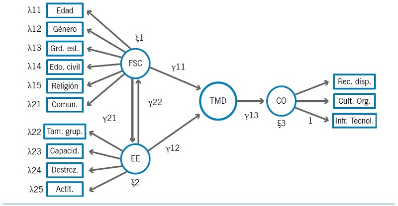 En la figura 4 mostramos el modelo causal propuesto, en el cual se observan los factores socioculturales (FSC), los factores de la estructura del equipo (EE) y los factores del contexto organizativo (CO) que influyen en la integración en equipos de trabajo multidisciplinario (TMD). Las variables exógenas son los FSC (ξ1), AF (ξ2) y FA (ξ3); las endógenas, la TMD (η1). La edad (λ11), género (λ12), último grado de estudios (λ13) y estado civil (λ14) …………. λ33. Las relaciones que existen entre los constructos están determinadas por γ11 (FSC-TMD), γ12 (EE-TMD), γ13 (CO-TMD), γ21 (FSC-EE) y γ22 (EE-FSC) y se pueden indicar como hipótesis con base en las necesidades de los investigadores y del estudio.