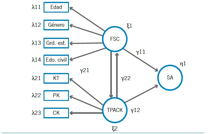 La figura 7 (página siguiente) contiene el modelo causal propuesto que evalúa el impacto de los FSC, factores del conocimiento tecnológico pedagógico y de contenido (TPACK), cuando el profesor hace uso de un LMS como apoyo en su actividad docente (SA). Indicamos las variables latentes y endógenas (η1), como la SA, y las exógenas, como los FSC (ξ1) y TPACK (ξ2). Entre las variables observadas endógenas, se encuentran λ11 (edad), λ12 (género), λ13 (último grado de estudios) y λ14 (estado civil), λ21 (conocimiento tecnológico), λ22 (conocimiento pedagógico) y λ23 (conocimiento del contenido curricular). Las relaciones entre los constructos están determinadas por γ11 (FSC-SA), γ12 (TPACK-SA), γ21 (FSC-TPACK), así como γ22 (TPACK-FSC).