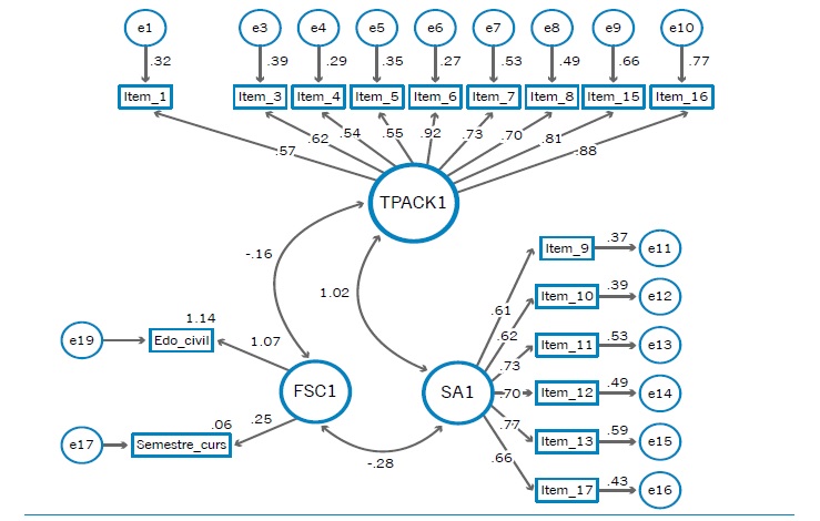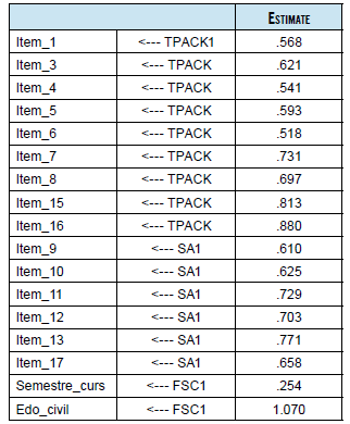 Para determinar los ítems que pertenecen a cada variable latente, examinamos los valores estandarizados de las cargas factoriales respecto a cada una de las variables que se muestran en la tabla 3 (página siguiente); tomamos el criterio de aceptar aquellos que tengan un valor mínimo de 0.4. En lo que se refiere a las cargas factoriales de los ítems de la variable latente TPACK, todos tienen un valor mayor de 0.5; por lo tanto, presentan una aceptable carga factorial y se aceptan todos los ítems; lo mismo sucede con la variable SA1. El ítem semestre cursado no tiene una carga aceptable, pues es de 0.254, por lo cual decidimos quitarlo. En el modelo original aparecía la variable campus donde estudias, pero como esta prueba se realizó en un solo instituto, la prueba estadística la consideró como una constante; por ello, la eliminamos y se redujo el número de ítems o variables observadas de 19 a 17.