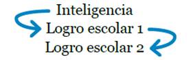 La inteligencia es una variable latente independiente; el logro escolar 2 es una variable dependiente porque hay una flecha que apunta hacia este desde el logro escolar 1. Sin embargo, hay una flecha que apunta a logro escolar 1 desde inteligencia y otra flecha de logro 1 a logro 2. En este modelo básico de ecuación estructural logro 1 está predicho por inteligencia, pero después logro 1 predice a logro 2. logro 1 es primeramente una variable latente dependiente y luego una variable independiente. Este tipo de modelo de ecuaciones estructurales es posible e ilustra los efectos indirectos al usar variables latentes (Schumacker & Lomax, 2010).