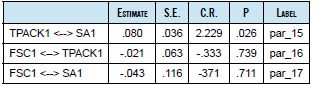 Respecto al análisis basado en la correlación, en la tabla 5 mostramos los valores estandarizados, por lo que los valores entre las variables latentes son las correlaciones. La correlación entre la variable FSC1 y TPACK1 es negativa, lo mismo pasa con FSC1 y SA1, no así entre TPACK1 Y SA1. Lo anterior nos indica que únicamente existe una relación entre las variables latentes TPACK1 y SA1. Esta afirmación se obtiene tanto con los valores de la covarianza como con los de la correlación.