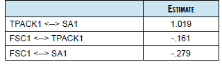 En cuanto a la relación que existe entre las variables latentes, el análisis lo realizamos con base en la covarianza y la correlación. Respecto a la covarianza, la tabla 4 (página siguiente) contiene los valores no estandarizados entre las variables latentes. Recordemos que, cuando los valores son no estandarizados, los valores estimados entre las variables latentes son las covarianzas; en este caso, el valor entre FSC1 y TPACK1 es negativo (-0.021) y lo mismo sucede entre FSC1 y SA1 (-0.043); en cambio, el valor entre TPACK1 y SA1 es positivo (0.080), por lo tanto, solo existe relación entre estas dos variables.