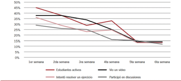 En ambas versiones del MOOC identificamos que cerca de 40% de los inscritos estuvo activo en algún momento del desarrollo del curso. Como en la mayoría de los cursos masivos, la participación se concentra en las primeras semanas y luego se evidencia una curva descendente. La participación en alguna de las actividades evaluativas estuvo en un rango entre 12% y 45%. La actividad con mayor participación fue la visualización de los contenidos en video, mientras que la de menor participación fue la interacción a través de foros (ver Gráfica).