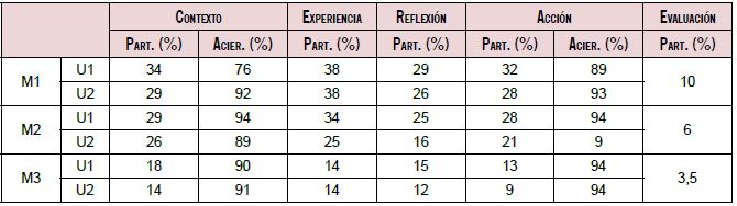 Como indicamos en el apartado de diseño, el curso se estructuró en tres módulos de contenido, cada uno constituido, a su vez, por dos unidades. Las unidades se desarrollaron a través de cuatro momentos del PPL La participación y el desempeño de los estudiantes en cada uno de estos se sintetiza en la Tabla 1.