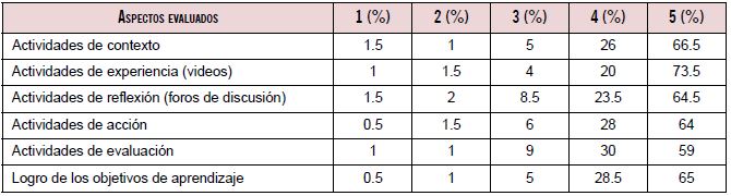 Para identificar la valoración del curso que hicieron los estudiantes, establecimos dos mecanismos: encuestas de satisfacción y foros de evaluación. Las primeras se aplicaron al cierre de cada módulo (tres en total) y al finalizar el MOOC. Estas encuestas, en escala Likert con cinco niveles, indagaban la valoración de los participantes en seis aspectos: la pertinencia de las actividades de contextualización, los contenidos en formato audiovisual, los espacios de interacción y reflexión con pares, la evaluación del aprendizaje a través de exámenes tipo formulario, la evaluación de actividades de escritura entre pares y, en general, el cumplimiento de los objetivos de aprendizaje propuestos en los módulos.
