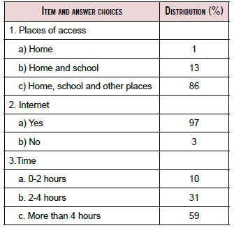 The data in the first questionnaire section were checked to identify the number of learners, who responded to one of the possible answers to the questions. Tables 1 and 2 present the percentage distribution of learners across the answers. Table 1 shows 86% of the participants had access to ICT not only at school, but also at home and other places. Most learners (97%) had access to Internet connectivity; and many (59%) of them used ICT for more than four hours daily. Table 2 shows students were immersed in technological access and had sustained Internet connectivity.