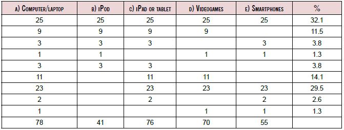 The questionnaire (available at www.jesusizqui-erdo.net/cuestionarioTIC.pdf) elicited information about the ICT children used, what they used them for and what they liked about them. The questionnaire items were based on a literature review, as suggested by Dörnyei (2010) and Fabila, Minami & Izquierdo (2012). It included items with rating scales where children expressed their opinions through degrees of agreement or frequency and items with multiple-choice answers.