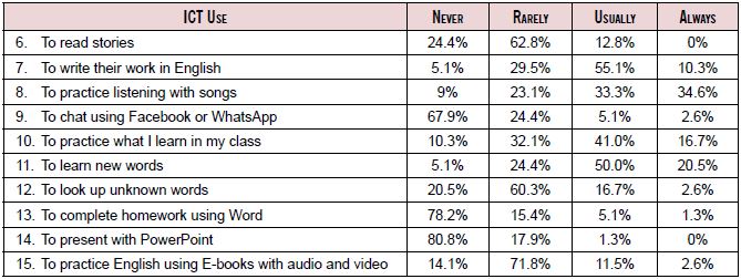In Table 3, most students frequently used technologies to write in English (65.4%), to practice listening through songs and videos (67.9%), and to learn and practice vocabulary (70.5%). It also reveals that approximately a half of the children frequently use technology to practice what they learn in class (57.7%), a large percentage of students infrequently use technology to chat with friends (92.3%), for looking up new words (80.8%) or to complete schoolwork (93.6%) and presentations (98.7%).