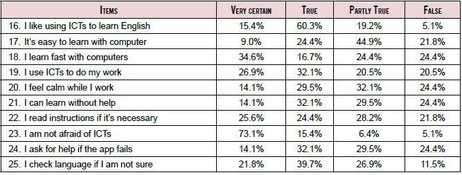 In regard to item 23 , the majority of the participants (88.5%) were not afraid of the ICT. The results for item 16 indicated 75.7% of the children liked using ICT to learn English. One third of the participants (33.4%, item 17) felt that it was easy to learn using computers and around half of the children considered they learn English faster using computers than books (54.3%; item 18). More than a half (59%) liked to use a computer to do their English work (item 19), and almost half of the group (43.6%) indicated they felt calm while using computers.