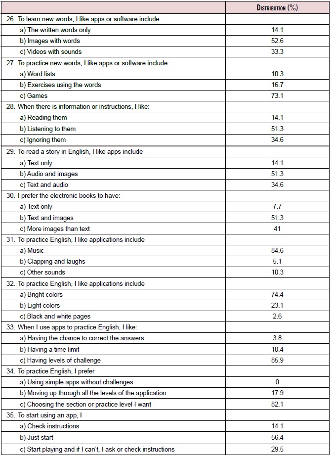 A very small number of children (7.7%) liked E-Books which include text only. Answers to items 29 and 30 show children liked resources where L2 comprehension is supported with audio and images. Questions 31 through 35 examined the features and properties of applications children liked to practice the L2. The answers to items 31 and 32 indicated children liked apps that include images with bright colors (item 32; 74.4%) and music (item 31; 84.6%).