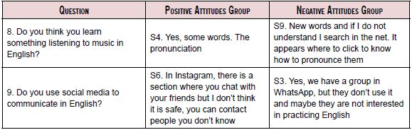 The first block of questions elicited children's opinions about the use of technology for L2 learning. Table 6 presents some excerpts that illustrate children's thoughts in regard to two questions. The first one related to L2 learning and the second one about the use of social media. In their answers, young learners indicated they used some ICT for deliberate language learning purposes, but were not able to see the L2 benefit of using other ICT types. For instance, they related the use of ICT to vocabulary and pronunciation learning through auditory media. Nonetheless, they did not see the opportunity to practice English through the use of social networks, which they accessed despite age requirements and security concerns. Instagram, WhatsApp and others social communication resources were used to communicate in Spanish with friends through messages or private chat rooms, because using the L2 did not seem natural.