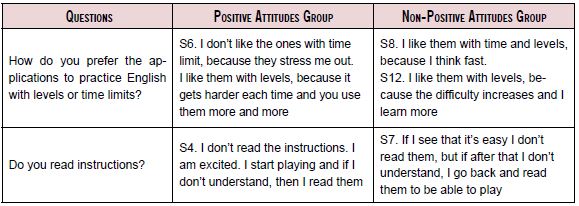 In their answers to questions in dimension 4, in Table 8, learners clearly identified challenge as the feature that most appeals to them in L2 learning resources. Without distinction of their initial attitudes, children enjoyed the challenge that apps and ICT raise through difficulty levels rather than time limit. When the difficulty level increases and they are able to succeed, they feel that are learning as their app record goes up. Moreover, difficulty levels allow them to notice their strengths and capabilities to succeed. The excitement, that challenge brings, makes instructions irrelevant since the use of the apps can be worked out through the actual task completion.