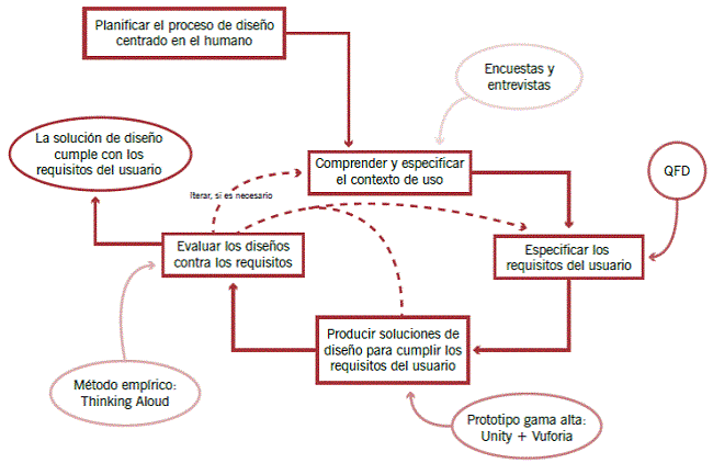 Si bien no existe duda de las ventajas que la RA tiene para un AVA, el punto focal del éxito en la integración de los dos ambientes se concentra en desarrollar recursos multimedios con RA que tomen en consideración los gustos, necesidades e intereses de los usuarios hacia los que van dirigidos, e integrar a estos los factores contextuales y socioculturales para que le permitan al usuario permear sus conocimientos previos con los nuevos de una manera natural o familiar. Por lo tanto, la construcción de los recursos debe exigir una metodología que respalde estos aspectos, papel que puede ser aportado por modelos como el diseño centrado en el usuario (DCU), de acuerdo con la norma ISO 9241-210.