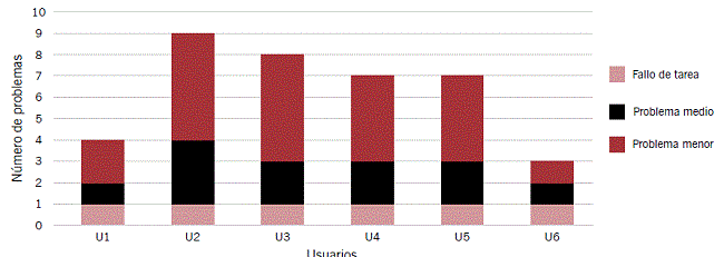 En la Figura 10 apreciamos que el U2 aportó más problemas medios y, de igual forma, el U2 y el U3 son los que más problemas menores detectaron; uno solo identificó más del 70% del total de problemas de usabilidad.