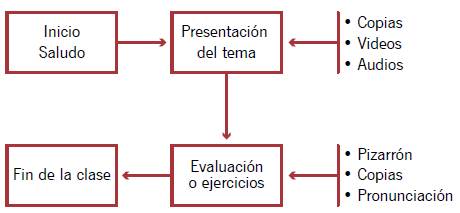 La segunda encuesta fue contestada en una página web e integró un mecanismo de ponderación denominado escala japonesa (Ruiz-Falcó, 2009), el cual acompaña al procedimiento del QFD para favorecer los requerimientos aprobados por el estudiante y penalizar los que no. Para esto, incorporamos a la página web figuras con las expresiones: feliz, neutral y triste, con puntajes de 9, 6 y 3, respectivamente; al final de la prueba, obtuvimos una lista ordenada por prioridad de los requisitos sugeridos. Los resultados de las encuestas aplicadas a los niños permitieron identificar los requisitos funcionales de la aplicación, el modelo mental que el alumno tiene sobre una clase de inglés (ver Figura 2), junto con su perfil de usuario (ver Tabla 1).