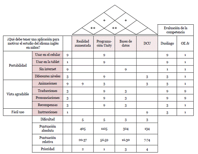 En la Figura 3 mostramos el QFD desarrollado para la obtención de los requerimientos del usuario. La lista de los "qués" es requisito obtenido de la encuesta aplicada a los niños, y se agrupan en tres principales características: portabilidad, vista agradable y fácil uso. Estas categorías fueron propuestas porque la suma de los requisitos logra un fin común. Los "cómos" se encuentran en la parte superior de las columnas, y son las herramientas y metodologías que se utilizarán para dar solución a los "qués". Los "cómos" fueron planteados con base en la investigación y comparación de distintas alternativas; se formularon en orden de prioridad, la integración del desarrollo en Unity con RA, las bases de datos y DCU para lograr los requisitos más frecuentes (qués).