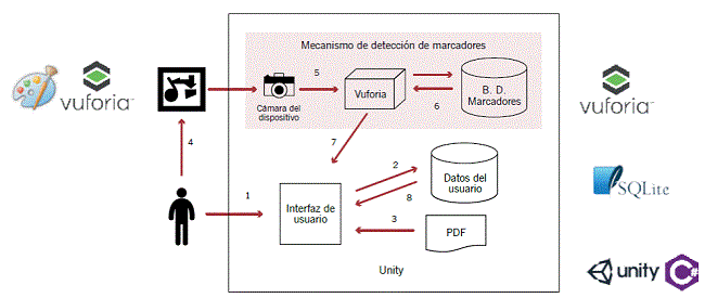 La arquitectura de English AR, acompañada de las tecnologías usadas para el desarrollo, se muestra en la Figura 4; en esta, el estudiante accede al documento PDF que contiene los 20 marcadores y hace uso de estos (1, 3, 4); los marcadores son localizados por el "Mecanismo de detección de marcadores", compuesto por la cámara del dispositivo (5), el plugin de Vuforia y la base de datos de marcadores (6). Una vez que este es identificado, el objeto asociado se puede ver dentro de la interfaz de usuario (7), la cual hace consultas constantemente a la base de datos del usuario (2, 8), realizada con el gestor de base de datos SQLite (SQLite Consortium, 2019). Todo lo anterior fue programado mediante el IDE de Unity en el lenguaje C#.