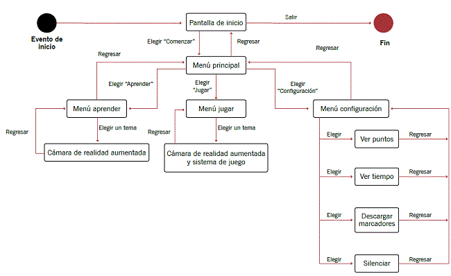 En el diagrama de estados de la aplicación English AR presentada en la Figura 5, podemos observar la navegación entre pantallas, que representa una guía de su distribución y el camino a seguir para ejecutar las distintas tareas permitidas.