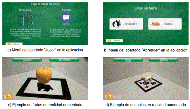 En la Figura 6 mostramos algunas de las pantallas de la interfaz de English AR, además de ejemplos de realidad aumentada de las dos categorías (animales y frutas) consideradas en el prototipo de gama alta.