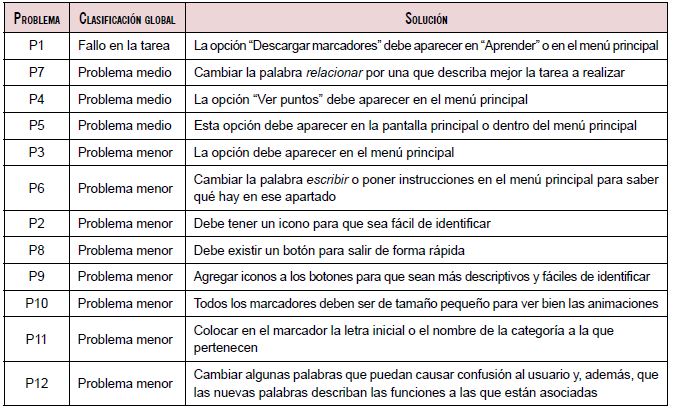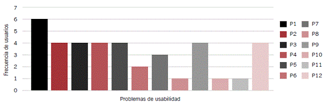 De igual manera, advertimos que seis problemas de usabilidad (P2, P3, P4, P5, P9 y P12) fueron reconocidos por cuatro usuarios, de los cuales la mayoría fueron clasificados como problemas menores, puesto que se realizaron con un retraso de tiempo pequeño. Los problemas P8, P10 y P11 únicamente fueron identificados por un usuario; es de resaltar que estos problemas no influyen de manera directa en el funcionamiento de la aplicación, pero son relevantes para aplicar posibles mejoras tanto en la parte visual como en la conceptual.