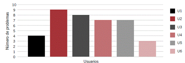 En la Figura 8 observamos que el usuario más informativo para las mejoras fue el U2, al ubicar un total de nueve problemas de usabilidad; el que destacó menos fue el usuario U6, con tres problemas de usabilidad.