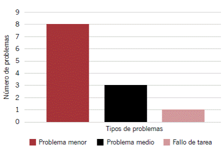 En la Figura 9 se refleja la identificación de ocho problemas menores, tres problemas medios y uno clasificado como fallo de tarea. El hecho de que gran parte de los problemas de usabilidad reconocidos sean menores y solo exista un fallo de tarea indica que la interpretación del modelo mental del usuario y que los requisitos planteados, en su mayoría, fueron reflejados de forma correcta dentro de la aplicación.