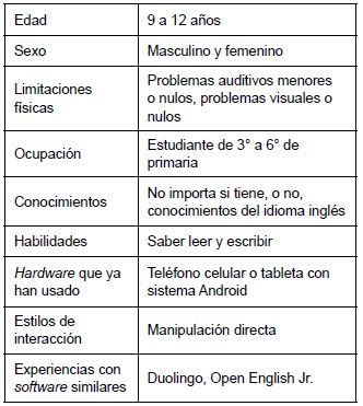 Recabamos información adicional con la ayuda de dos profesores de inglés a nivel primaria, mediante una entrevista acerca del contenido temático adecuado para el alumnado, según el grado escolar en que se encuentren; por ejemplo, los saludos y los objetos cotidianos para los primeros grados, y para los más avanzados, las conjugaciones de los verbos y la traducción de texto; además, información sobre cómo se imparten las clases de inglés, con la finalidad de motivar al estudiante en la clase y, de esa manera, integrar alguna de esas estrategias en la aplicación. Como resultado, identificamos que, en una clase, los docentes primero explican el tema y después llevan a cabo ejercicios o evalúan; para motivar a sus alumnos, realizan trabajos en equipo y los premian con puntos de participación. Los recursos digitales más usados son los videos y los audios.