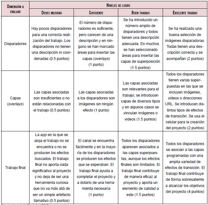 La evidencia actual sobre la evaluación de proyectos educativos que usan RA es muy heterogénea; por ejemplo, Swan y Gabbard (2009) afirman que solo 8% de las investigaciones publicadas sobre RA incluyen evaluaciones formales, y una de las razones es la falta de métodos adecuados para las diversas interfaces de la RA (Dünser & Billinghurst, 2011). Este estudio utilizó una rúbrica que permitió valorar el proyecto de RA articulado con la interfaz de la aplicación que, en este caso, fue HP Reveal®. La evaluación que hicimos a los alumnos arrojó datos de tipo cuantitativo, los cuales podrían ser solo una aproximación numérica, pero de alta significancia para los alumnos, como lo explica Da Silva et al. (2019) en su revisión sistemática de las perspectivas de cómo evaluar las herramientas tecnológicas de RA empleadas en la educación.