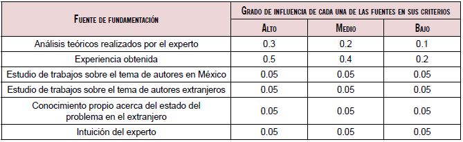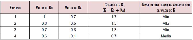 Los resultados de K para cada experto son mostrados en la Tabla 3, así como los valores de Kc y Ka. Una vez obtenido el valor de K, clasificamos a los expertos en tres grupos: los que tienen una alta influencia de las fuentes (K > 0.8), aquellos con una influencia media de las fuentes (K < 0.8 y ≥ 0.5), y los de influencia baja (K <0.5). De los expertos, tres de ellos mostraron un nivel de influencia alta (valor de K > 0.8) y uno, de media (valor de K < 0.8 y ≥ 0.5), lo cual sugiere un buen grado de dominio del tema de investigación (ver Tabla 3).