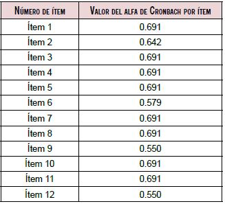 Con apoyo del programa SPSSStatistics (versión para Macintosh), calculamos el valor del alfa de Cronbach para cada ítem, por dimensión, y el promedio del total del instrumento, con el objetivo de lograr la fiabilidad y consistencia interna; los valores estadísticos son mostrados en la Tabla 4. La rúbrica presentó una consistencia interna baja con un valor total de alfa de Cronbach de 0.686; el parámetro mínimo sugerido para las ciencias sociales es de 0.7, según Celina y Campo (2005), lo cual sugiere un futuro rediseño del instrumento a fin de incrementar sus valores de consistencia interna; cabe mencionar que esto no es objeto de estudio de este artículo.