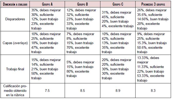 De esta forma, agrupamos los ítems conforme a las dimensiones propuestas en el instrumento original: disparadores, capas (overlays) y trabajo final. Los expertos se dieron a la tarea de evaluar cada uno y los clasificaron en las siguientes categorías según su juicio y experiencia: 1) no cumple, 2) bajo nivel, 3) moderado, y 4) alto nivel. El análisis del alfa de Cronbach de los datos es mostrado en la Tabla 1. Con base en Welch y Comer (1998), la fiabilidad mediante este alfa asume que los ítems miden un mismo constructo y que están altamente correlacionados. El puntaje máximo posible de la rúbrica fue de 10 puntos y el mínimo, de 1.5, en el cual se consideraron los elementos básicos para la evaluación del proyecto.