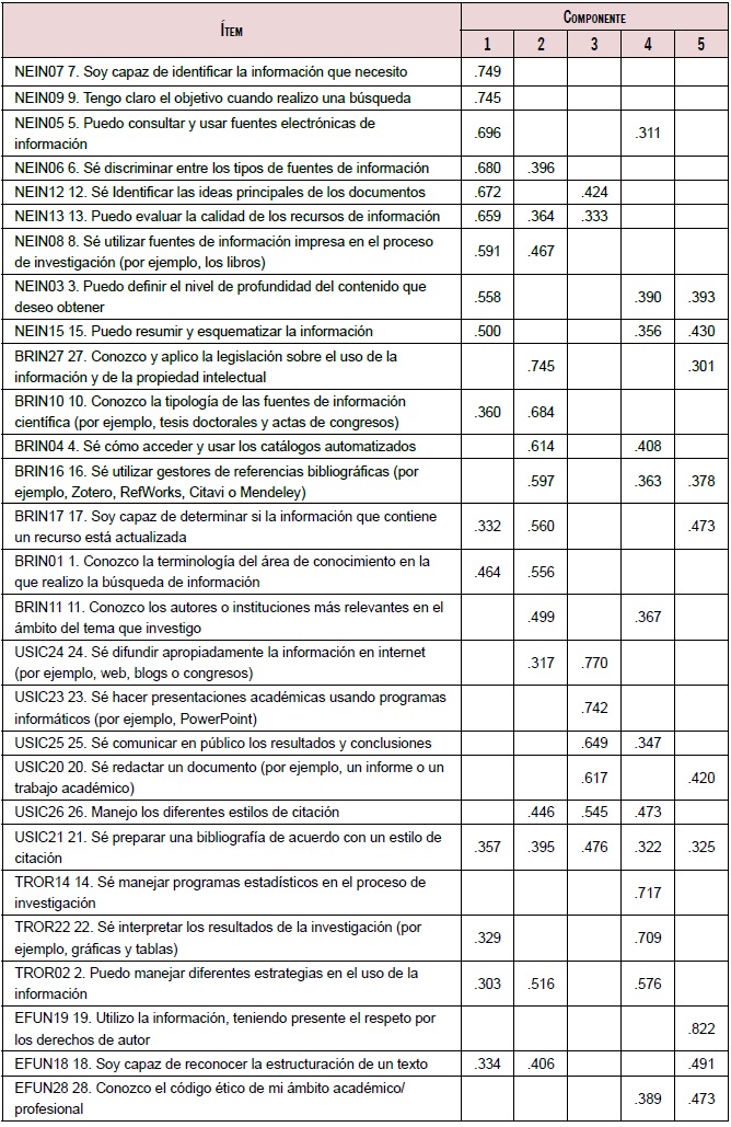 El instrumento sobre habilidades informativas quedó integrado por 28 ítems, divididos en cinco dimensiones: